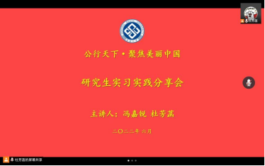 2022年6月8日晚上,我院第八期“公行天下·聚焦美丽中国”学术沙龙在腾讯会议通过线上方式举办。本次沙龙分享会以“研究生实习实践经历分享”为主题,主讲人为我院两名2021级硕士研究生,共吸引百余名公管学子参加。