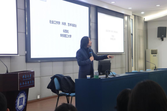 2023年3月23日下午2:00,华东理工大学社会与yl23455永利官网院长、教授、博士研究生导师,中国社会工作教育协会常务理事、副秘书长,中国社会学学会常务理事,全国社会工作专业学位教指委委员何雪松教授受邀在我院院楼404室,进行了主题为“社会工作学:科学、艺术与政治”的中南讲堂·名师名家论坛系列讲座。我院共计百余名师生聆听了此次讲座,本次讲座由我院副院长潘泽泉教授主持。