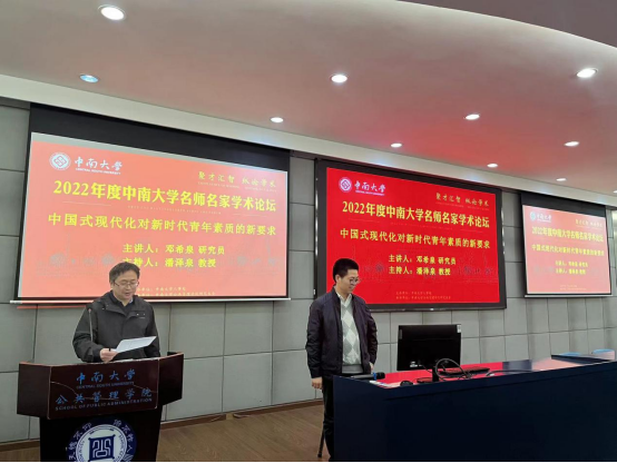 2023年4月6日下午3:30,中国青少年研究中心研究员,共青团与青年工作高端智库专家,北京青年研究会会长,中国社会学会青年社会学分会副理事长邓希泉研究员受邀在我院院楼404室,进行了主题为“中国式现代化对新时代青年素质的新要求”的中南讲堂·名师名家论坛系列讲座。我院共计百余名师生聆听了此次讲座,本次讲座由我院副院长潘泽泉教授主持。