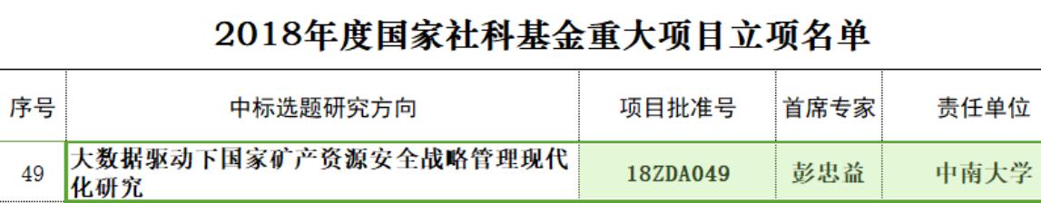 2018年11月6日,全国哲学社会科学规划办公室公布2018年度国家社科基金重大项目立项名单,我院行政管理系教授、中南大学地方治理研究院院长彭忠益为首席专家申报的《大数据驱动下国家矿产资源安全战略管理现代化研究》获准立项。