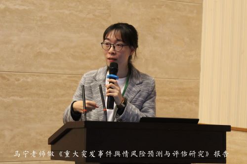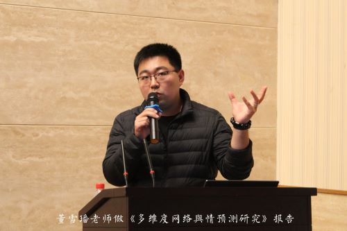 第三阶段为下午主题演讲,由我院董海军教授主持。中科院科技战略咨询研究院王红兵老师做《基于大数据的决策支持平台基础架构研究》的主题汇报。王老师向大家介绍了决策支持系统(DSS)的发展背景及大数据决策支持平台架构过程,并以社会治理大数据平台及国家公园大数据平台的构建为例进行详细阐述;最后讲述了大数据的调研应用。中科院马宁老师做《重大突发事件舆情风险预测与评估研究》的主题汇报。马老师提出突发事件舆情传播中的各类“风险点”是引爆舆论场、引发舆情危机的“助燃剂”;根据对已识别的历史突发事件舆情风险点的类型、数量、频率等,可以定量判断新发生突发事件的舆情风险等级。中科院董雪璠老师做《公共政策引发的网络舆情多维度预测研究》的主题汇报。董老师从主体结构、持续时间、信息波动、情绪交互四个维度进行网络舆情预测,并以“股市熔断机制”的案例做实证研究分享。