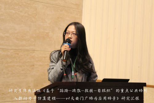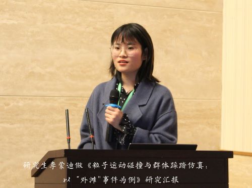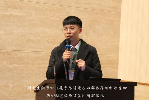 此外,吕鹏教授团队成员做基于社会物理学视角的专题研究汇报。学院研究生张卓做《微粒运动、恐怖袭击与ABM仿真模拟: 社会物理学视角》研究汇报,李蒙迪做《粒子运动碰撞与群体踩踏仿真: 以“外滩”事件为例》研究汇报,阳厚做《基于恐怖袭击与群体踩踏机制叠加的ABM建模与仿真》研究汇报,陈典涵做《基于人群拥挤-踩踏-救援-自组织的重点公共场所仿真建模》研究汇报。汇报涉及微粒运动建模、暴徒袭击及群体踩踏事件ABM仿真等方面。