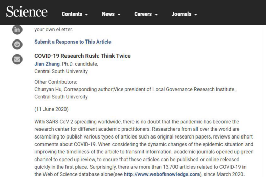 2020年6月11日,我院公共管理系胡春艳教授与2019级博士生张建在国际顶级自然科学期刊杂志《Science》(《科学》)eletters栏目,在线合作发表《COVID-19 Research Rush: Think Twice》一文。