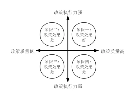 胡春艳根据政策周期理论,公共政策过程包括问题确认、政策制定、政策执行、政策评估、政策终结等环节,理论上只要每个环节都不出差错,政策的预期效果就可以达到。作为政策周期中最重要的两个环节,政策制定和政策执行无疑对政策效果产生了重要影响。因此,本文构建了政策效果、政策质量和政策执行力三者间关系的理想类型。首先,政策质量与政策执行力相互作用,政策效果会呈现出四种不同的理想状态(详见下图):
