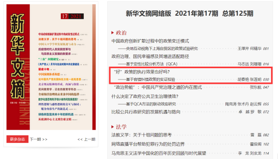 2022年4月28日,yl23455永利官网胡春艳教授与研究生张莲明2021年在《公共行政评论》发表的论文《“好”政策的执行效果也好吗?——基于容错纠错政策的实证检验》被《新华文摘》(数字版)2021年第17期(半月刊)“政治”栏目全文转载。